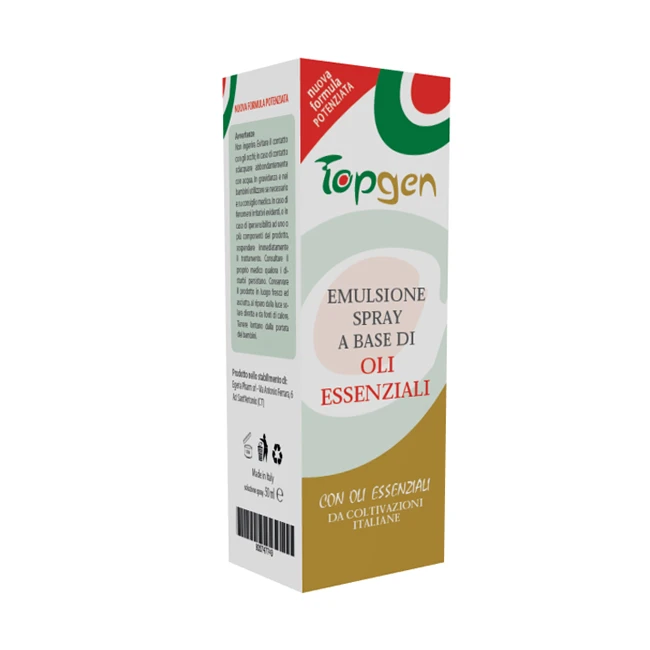 Topgen a base di calcio carbonato, olio di oliva, olio di argan, o.e. di origano, o.e. di lavanda, olio di germe di grano e polpa di pala di fico d'india. Indicato per gli stati di alterazione della cute, forma un film con effetto barriera, protegge la cute da eventuali aggressioni di agenti esterni e mantiene le normali condizioni di idratazione ed emollienza. Dona un effetto rinfrescante e aiuta a ridurre la sensazione di prurito grazie alla presenza dell'olio di argan, mentre l'olio di lavanda lascia un gradevole profumo.