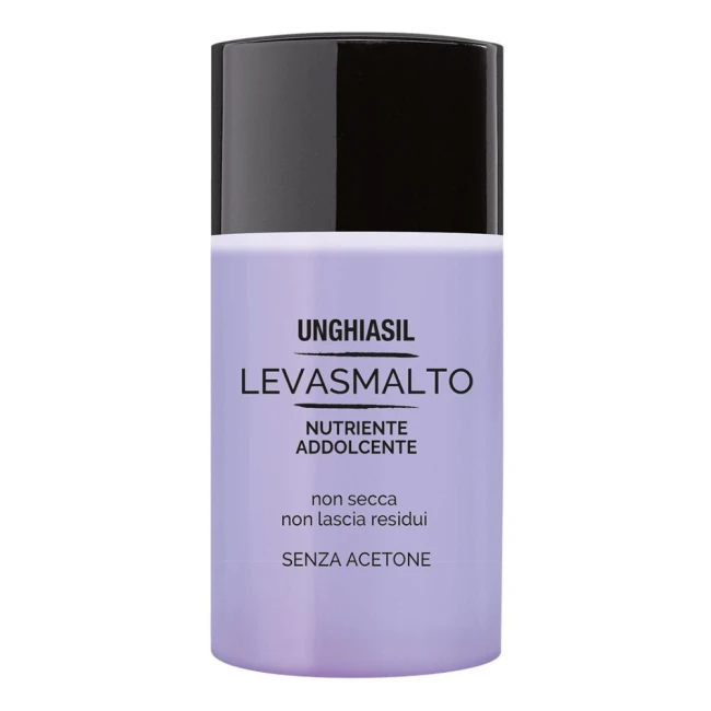 Unghiasil Levasmalto Nutriente e Addolcente non secca unghie e cuticole, non lascia residui untuosi. Senza acetone.
