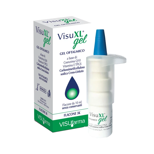 Visuxl Gel è un gel oftalmico lubrificante ed antiossidante senza conservanti a base di coenzima Q10, vitamina E TPGS e carbossimetilcellulosa sodica cross-linkata, indicato per un uso sia diurno che notturno. La carbossimetilcellulosa sodica cross-linkata è una sostanza biosintetica estremamente sicura ed inerte, più efficace e durevole nel tempo. La sua reticolazione e la mancanza di enzimi specifici in grado di degradare la molecola a livello della superficie oculare, stabilizza il polimero dandole un'emivita più lunga rispetto ai classici acidi ialuronici. Inoltre, la carbossimetilcellulosa sodica cross-linkata è un idrogel che al suo stato nativo presenta specifiche caratteristiche di visco-supplementazione, idratazione, mucomimetiche e di veicolazione di sostanze. La combinazione di carbossimetilcellulosa sodica cross-linkata e sostanze antiossidanti/antiradicali conferisce a Visuxl Gel un'azione più efficace nei casi di: