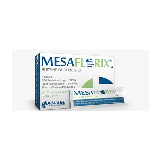 Mesaflorix è un integratore che grazie ai suoi probiotici e prebiotici, favorisce l'equilibrio della flora intestinale. È un complemento alimentare a base di Bifidobacterium longum BB536, Frutto-oligosaccaridi, Camomilla, Zinco e Vitamine del Gruppo B: