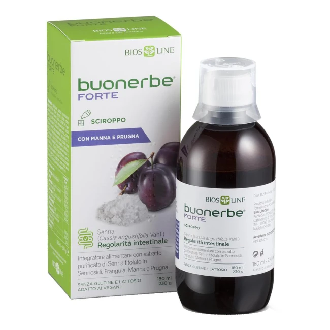 Buonerbe Forte sciroppo favorisce il regolare transito intestinale grazie alla sua formulazione a base di estratto purificato di Senna, titolato al 20% in sennosidi, e di estratto di Frangula, titolato al 20% in glucofranguline, mentre la Malva svolge un'azione emolliente e lenitiva sulla mucosa intestinale. Buonerbe Forte sciroppo contiene inoltre Manna da Frassino, che favorisce una normale consistenza delle feci ed estratto di Prugna, ricca in sorbitolo.