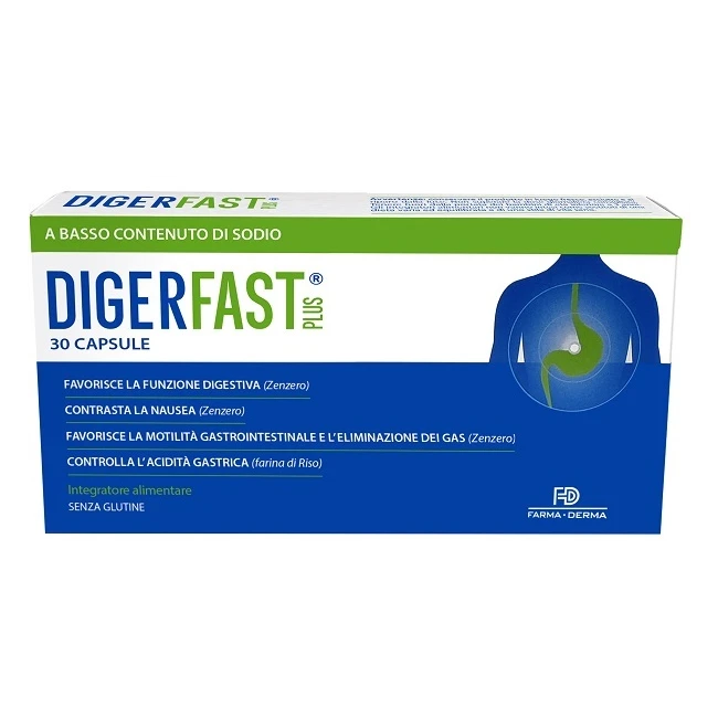 Digerfast plus è un integratore alimentare a base di zenzero, farina di riso, magnesio e vitamine del gruppo B (B1, B2 e B6). Lo zenzero ha funzione digestiva e antinausea, aiuta a favorire la motilità gastrointestinale e l'eliminazione dei gas, oltre a contrastare gli stati di tensione localizzati e i disturbi del ciclo mestruale. La farina di riso favorisce il controllo dell'acidità gastrica e svolge un'azione emolliente e lenitiva a livello del sistema digerente. Il magnesio contribuisce al mantenimento dell'equilibrio elettrolitico.