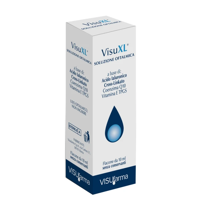 VISUXL è una soluzione oftalmica lubrificante e antiossidante senza conservanti a base di Coenzima Q10, Vitamina E TPGS e Acido Ialuronico sale sodico Cross-Linkato.
