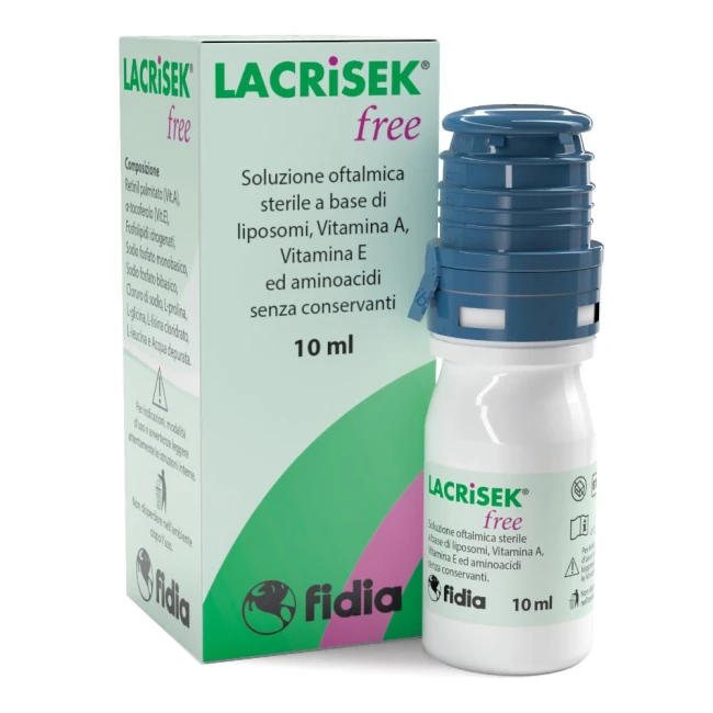 LACRISEK Free soluzione oftalmica stabilizza lo strato lipidico del film lacrimale, regola e corregge la lubrificazione della superficie oculare.