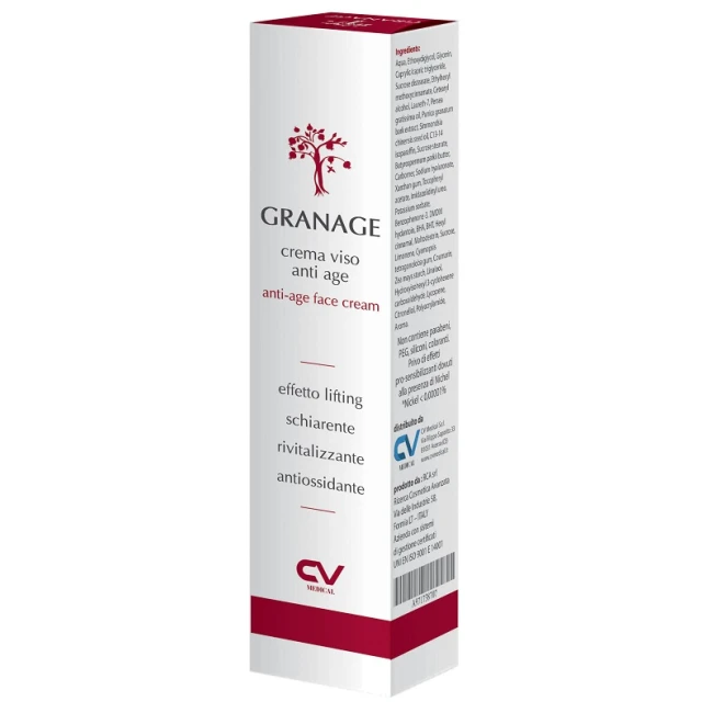 Granage è una crema anti-age che con uno spiccato effetto schiarente rende la pelle più vitale, fresca e luminosa. Confermandone la peculiare attività cosmetologica, recenti ricerche hanno individuato diverse sostanze attive nel melograno quali Acido Ellagico, polifenoli, di cui fenoli semplici, tanniti e flavonidi, tutti potenti antiradicali liberi con azione anti-age. Inoltre l'acido ellagico e l'acido ascorbico contenuti nel melograno inibiscono la melanogenesi producendo notevoli effetti schiarenti.