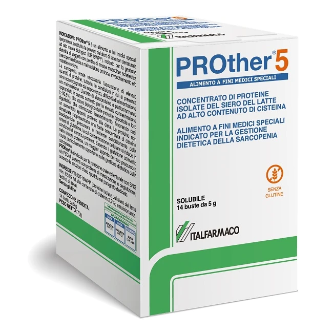 Si consiglia l’assunzione di 1 o 2 buste al giorno. Mettere 1 o 2 buste di Prother® 5 solubile in un bicchiere. Aggiungere da 150 a 200 ml di acqua o qualsiasi altra bevanda (latte, tè) purché fredda o, comunque, a temperatura ambiente. Mescolare brevemente (senza usare il frullatore) e bere immediatamente. In considerazione della sua solubilità, è consentita la somministrazione di 1-2 buste di Prother® 5 da diluire in 500– 1000 ml di acqua, in base al calcolato fabbisogno idrico e proteico del paziente, attraverso sonda nasogastrica e/o PEG, secondo il giudizio del medico.