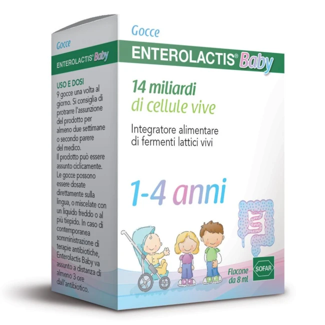 gocce una volta al giorno. Si consiglia di protrarre l'assunzione del prodotto per almeno due settimane o secondo parere del medico. Il prodotto può essere assunto ciclicamente. Le gocce possono essere dosate direttamente sulla lingua, o miscelate con un liquido freddo o al più tiepido. In caso di contemporanea somministrazione di terapie antibiotiche, Enterolactis Baby va assunto a distanza di almeno 3 ore dall'antibiotico.