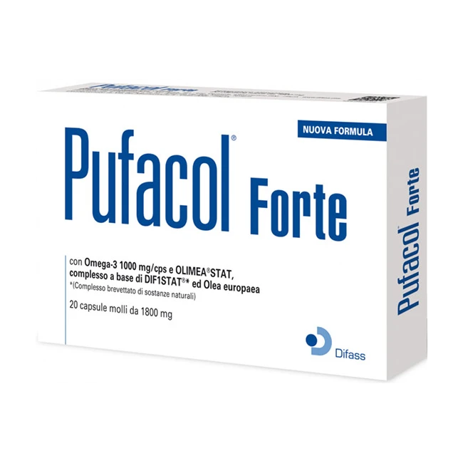 Pufacol® Forte contiene acidi grassi Omega-3 EPA e DHA e OLIMEA®STAT, complesso a base di DIF1STAT® ed Olea europaea. L’EPA e il DHA aiutano il regolare funzionamento cardiaco. L'Estratto di Olea europaea coadiuva il metabolismo lipidico e contribuisce a mantenere la normale pressione sanguigna. La presenza di Vitamina B6, B12 e Acido folico contribuisce al normale metabolismo dell'omocisteina. La Vitamina E aiuta a proteggere le cellule dallo stress ossidativo.