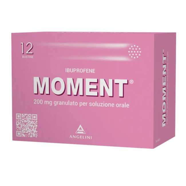 PosologiaAdulti e adolescenti oltre i 12 anni: 1-2 bustine, 2-3 volte al giorno. Sciogliere il contenuto della bustina in un bicchiere di acqua mescolando con un cucchiaino fino a dissoluzione e bere immediatamente la soluzione. Non superare la dose di 1200 mg (6 bustine) al giorno. Nel caso l’uso del medicinale sia necessario per più di 3 giorni negli adolescenti di età pari o superiore a 12 anni o nel caso di peggioramento della sintomatologia, deve essere consultato il medico. Non superare le dosi consigliate. I pazienti anziani devono attenersi ai dosaggi minimi sopraindicati (vedere paragrafo 4.4). Gli effetti indesiderati possono essere minimizzati con l’uso della dose minima efficace per la durata di trattamento più breve possibile necessaria per controllare i sintomi (vedere paragrafo 4.4). Compromissione renale: nei pazienti con lieve o moderata riduzione della funzione renale, il dosaggio deve essere mantenuto il più basso possibile per la più breve durata necessaria a controllare i sintomi e la funzione renale deve essere monitorata. Compromissione epatica: nei pazienti con lieve o moderata riduzione della funzionalità epatica, il dosaggio deve essere mantenuto il più basso possibile per la più breve durata necessaria a controllare i sintomi e la funzione epatica deve essere monitorata. Moment è controindicato nei pazienti con grave insufficienza epatica (vedere paragrafo 4.3). Popolazione pediatrica Moment è controindicato nei bambini di età inferiore ai 12 anni (vedere paragrafo 4.3). Modo di somministrazione Sciogliere il contenuto della bustina in un bicchiere di acqua mescolando con un cucchiaino fino a dissoluzione e bere immediatamente la soluzione. È possibile assumere Moment a stomaco vuoto. Nei soggetti con problemi di tollerabilità gastrica, è preferibile assumere il medicinale a stomaco pieno.