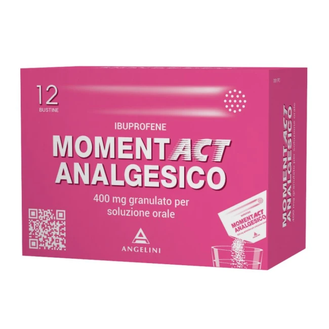 PosologiaPosologia Adulti e adolescenti oltre i 12 anni: 1 bustina 2-3 volte al giorno. Non superare la dose di 3 bustine al giorno. Gli effetti indesiderati possono essere minimizzati con l’uso della dose minima efficace per la durata di trattamento più breve possibile necessaria per controllare i sintomi (vedere paragrafo 4.4). Nel caso l’uso del medicinale sia necessario per più di 3 giorni negli adolescenti, o nel caso di peggioramento della sintomatologia, deve essere consultato il medico. Non superare le dosi consigliate: in particolare i pazienti anziani devono attenersi ai dosaggi minimi sopraindicati. Anziani: i FANS devono essere usati con particolare cautela nei pazienti anziani che sono più inclini a eventi avversi e sono ad aumentato rischio di emorragia gastrointestinale potenzialmente fatale, ulcerazione o perforazione (vedere paragrafo 4.4). Se il trattamento è considerato necessario deve essere usata la più bassa dose per la più breve durata necessaria per il controllo dei sintomi (vedere paragrafo 4.4). Insufficienza renale: nei pazienti con lieve o moderata riduzione della funzione renale, il dosaggio deve essere mantenuto il più basso possibile per la più breve durata necessaria a controllare i sintomi e la funzione renale deve essere monitorata. Insufficienza epatica: nei pazienti con lieve o moderata riduzione della funzionalità epatica, il dosaggio deve essere mantenuto il più basso possibile per la più breve durata necessaria a controllare i sintomi e la funzione epatica deve essere monitorata. MOMENTACT ANALGESICO è controindicato nei pazienti con grave insufficienza epatica (vedere paragrafo 4.3). Popolazione pediatrica Momentact analgesico è controindicato nei bambini al di sotto dei 12 anni (vedere paragrafo 4.3). Modo di somministrazione Sciogliere il contenuto della bustina in un bicchiere di acqua mescolando con un cucchiaino fino a dissoluzione e bere immediatamente la soluzione. È possibile assumere MOMENTACT ANALGESICO a stomaco vuoto. Nei soggetti con problemi di tollerabilità gastrica, è preferibile assumere il medicinale a stomaco pieno.