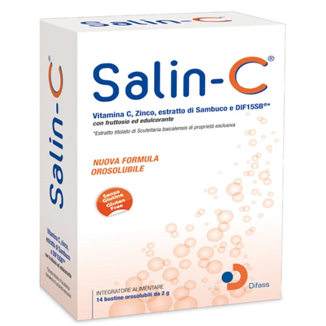 Salin-C® è un integratore alimentare di Vitamina C e Zinco con estratto di Sambuco e miscela di estratti titolati di Scutellaria. Salin-C® è indicato per favorire la normale funzione del sistema immunitario. La Vitamina C contribuisce alla riduzione della stanchezza e della fatica. Lo Zinco svolge una funzione antiossidante contribuendo a proteggere le cellule dai radicali liberi. Il Sambuco favorisce la fluidità delle secrezioni bronchiali, la funzionalità delle prime vie respiratorie e la regolarità del processo di sudorazione.