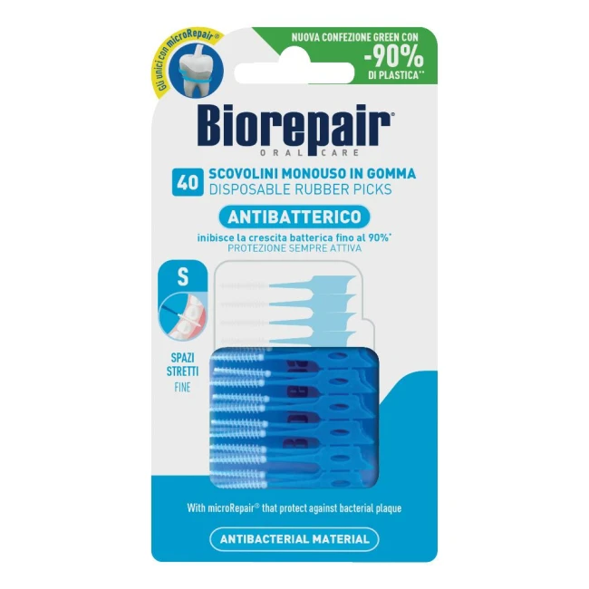 Scovolini interdentali in gomma Biorepair, realizzati con SCP antibatterico e microRepair, particelle fatte della stessa sostanza dello smalto che penetrando dove non arriva lo spazzolino, proteggono dalla formazione della placca batterica causa di carie ed infiammazioni gengivali. Grazie alle setole in gomma sono delicati sulle gengive e sullo smalto rimuovendo la placca e i residui di cibo più ostinati. Aroma menta fresca. Per uno smalto ancora più protetto utilizzale tutti giorni con i dentifrici e i collutori Biorepair.