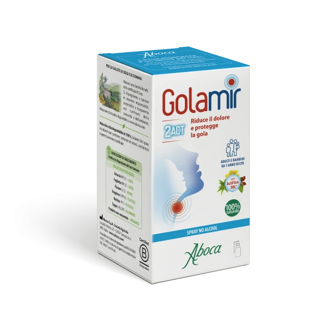 Golamir 2 Act spray, grazie al suo complesso attivo naturale Actifilm DOL agisce su dolore, bruciore e difficoltà di deglutizione proteggendo la mucosa dai fattori scatenanti l'irritazione.