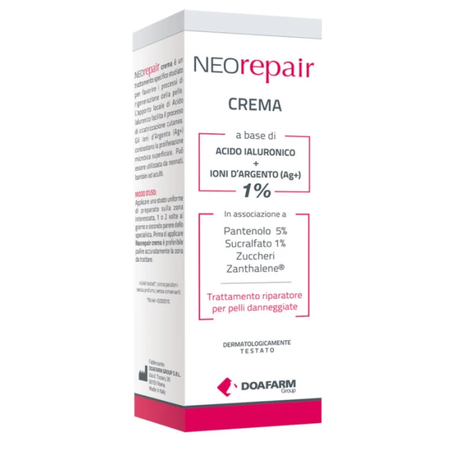 Neorepair crema è un trattamento specifico studiato per favorire i processi di rigenerazione della pelle. L'apporto locale di Acido Ialuronico facilita il processo di cicatrizzazione cutanea. Gli Ioni d'Argento (Ag+) contrastano la proliferazione microbica superficiale. Può essere utilizzata da neonati, bambini ed adulti.