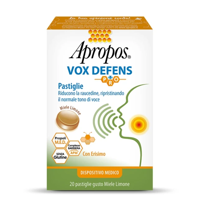 Dispositivo medico appositamente formulato per contribuire alla riduzione della raucedine, in caso di alterazione o perdita del tono di voce. Grazie al suo complesso barriera APM composto da "Attivi Polimerici Mucoadesivi", crea un film protettivo ad effetto barriera sulla mucosa orofaringea, proteggendo la zona dall'attacco di agenti esterni dannosi e permettendo agli attivi presenti nella pastiglia una maggior permanenza a contatto con la mucosa.