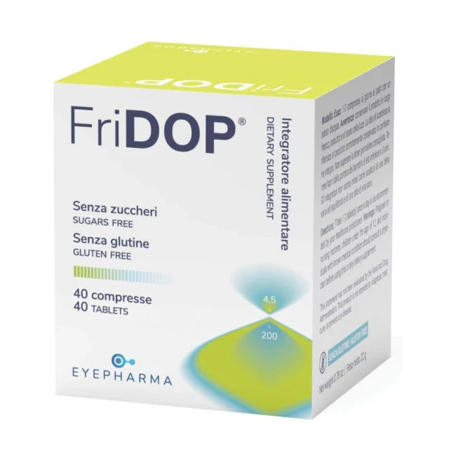 L’alga klamath è definita come “supercibo naturale compatto” in quanto contiene minerali, vitamine, amminoacidi, acidi grassi essenziali e molecole nutraceutiche come ficocianine, feniletilammina (PEA) e polisaccaridi. La vitamina E contribuisce alla protezione delle cellule dallo stress ossidativo. Il Mirtoselect è l’unico estratto di mirtillo (Vaccinium myrtillus L.) contenente il 36% di antocianine. Le antocianine da mirtillo nero contribuiscono a migliorare la funzionalità del microcircolo e favorire il benessere della vista migliorando la visione notturna, l’acuità e la funzionalità visiva. Gli elementi nutritivi contenuti in FRIDOP sono indicati per favorire il benessere della vista e in caso di apporto insufficiente di nutrienti o di aumentato fabbisogno degli stessi.