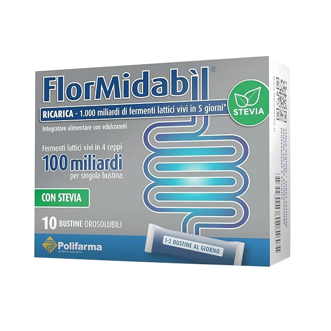 Un ciclo di Flormidabìl Ricarica comporta l’assunzione di 2 bustine al giorno (in un’unica soluzione), per un periodo di 5 giorni, da sciogliere direttamente in bocca oppure da sciogliere in un bicchiere di acqua o di altro liquido a temperatura ambiente. È possibile assumere anche solo 1 bustina al giorno in maniera continuativa. Assumere il prodotto nel momento più comodo della giornata (es: appena prima o subito dopo un pasto) rispettando però un intervallo di almeno tre ore dall’eventuale assunzione dell’antibiotico.