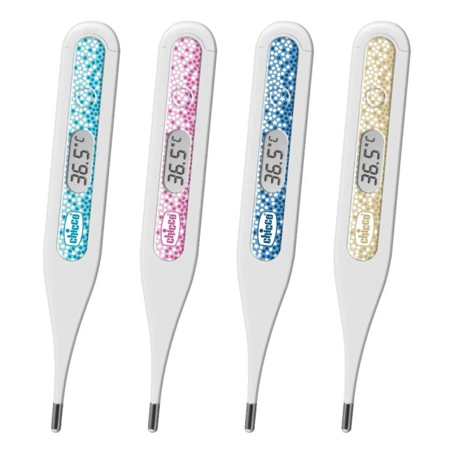 Termometro digitale pediatrico colorato che misura la temperatura del bambino in tre diverse modalità, ascellare, orale e rettale in 60 secondi.