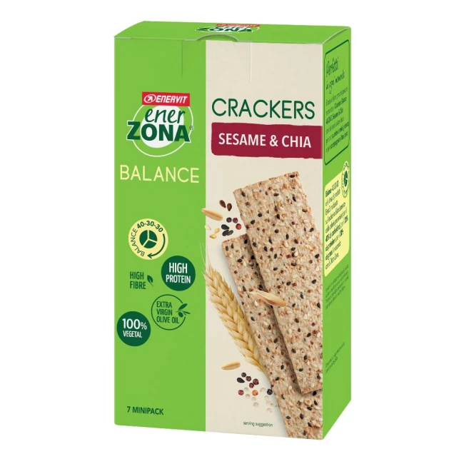 Enerzona crackers è lo snack salato bilanciato 40-30-30, ideale sia per chi segue la dieta zona sia per chi dà valore a un'alimentazione bilanciata, grazie alla sua formulazione perfettamente bilanciata nei macronutrienti (il 40% delle calorie proviene dai carboidrati, il 30% dalle proteine e il restante 30% dai grassi). Una ricetta unica ed esclusiva, 100% vegetale, ricca in fibre e in proteine, nata dalla combinazione di ingredienti attentamente selezionati e di altissima qualità.