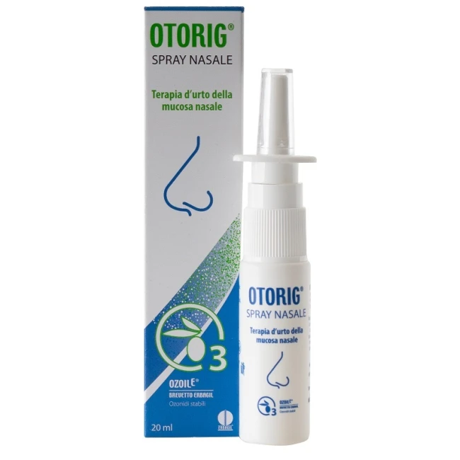 Dispositivo medico protettivo, decongestionante e igienizzante delle cavità nasali, specifico per la prevenzione e il trattamento delle affezioni rinofaringee sia acute che croniche caratterizzate da irritazione, gonfiore, prurito, bruciore, produzione eccessiva di muco. Formula innovativa, è un valido aiuto in caso sindromi influenzali, da raffreddamento, di natura allergica o da inquinanti ambientali e nei postumi operatori in ORL. Otorig spray nasale decongestiona le vie nasali, riduce l’ostruzione e regolarizza le secrezioni promuovendo uno scambio osmotico che favorisce il richiamo di fluidi dalla mucosa e fluidifica il muco facilitandone la rimozione. La sua formulazione con Ozoile mantiene ben idratata la mucosa e svolge un'importante azione igienizzante e protettiva creando un film lipidico mucoadesivo ostile alle alterazioni del microbiota che ripristina il buono stato delle cavità nasali.