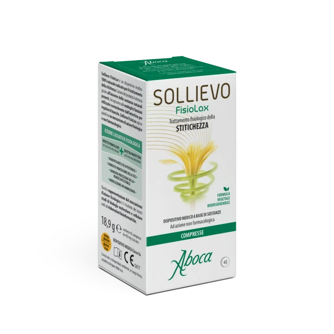 Sollievo FisioLax è un dispositivo medico 100% naturale indicato per il trattamento della stitichezza. L’azione del prodotto è ottenuta grazie all’insieme delle sostanze naturali presenti, che agiscono sulle molteplici funzioni utilizzate normalmente dall’intestino per regolare il transito. Sollievo FisioLax agisce quindi con un meccanismo di azione fisiologico e non farmacologico.