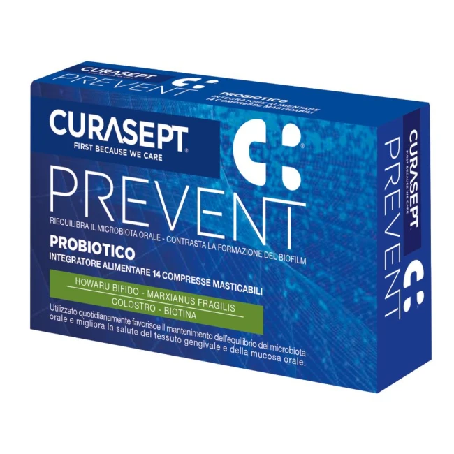 Curasept Prevent Probiotico contiene inoltre Colostro, che presenta numerose sostanze protettive per la mucosa ed enzimi antibatterici, e la biotina o vitamina B8, che aiuta il regolare/il buon funzionamento delle mucose del tratto digerente.
