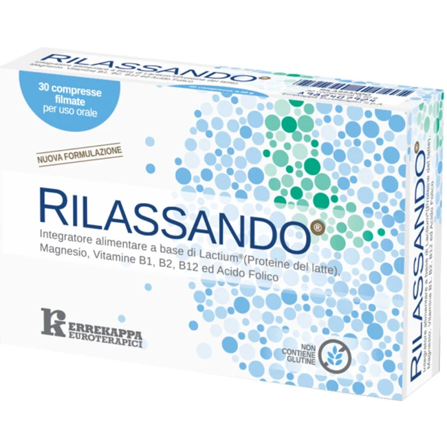 RILASSANDO® è un integratore alimentare a base di Lactium, magnesio, Vitamine del gruppo B ed Acido Folico. RILASSANDO® e` consigliato in tutti i casi di: stati d’ansia, insonnia, nervosismo, alterazione del tono dell’umore, affaticamento, cefalea, stress.