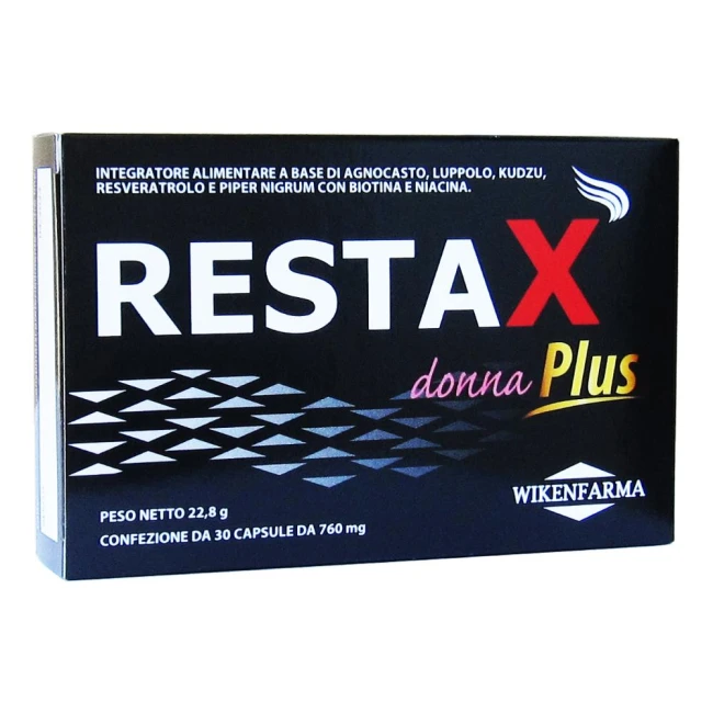 Restax donna plus è un integratore alimentare a base di agnocasto, luppolo, kudzu, resveratrolo e Piper nigrum con biotina e niacina. La biotina contribuisce al mantenimento di capelli normali, la niacina contribuisce al normale metabolismo energetico.