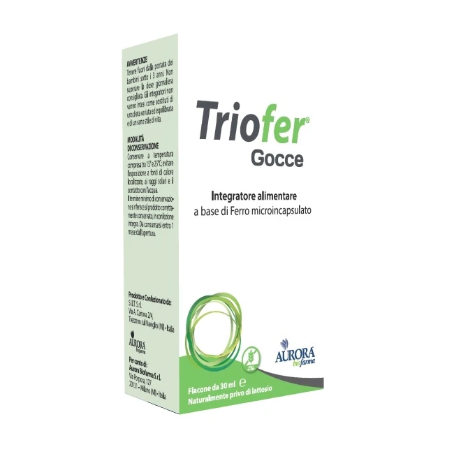 DescrizioneIntegratore alimentare a base di ferro microincapsulato, formulato per colmare le carenze alimentari o in caso sia necessario un aumentato apporto giornaliero di ferro. Il ferro contribuisce alla normale formazione di globuli rossi e dell'emoglobina e al corretto trasporto di ossigeno nell'organismo. Contribuisce al corretto sviluppo cognitivo dei bambini, al normale funzionamento del sistema immunitario e per ridurre stanchezza e affaticamento. Il ferro di Triofer Gocce è microincapsulato e in grado di superare indenne l'ambiente gastrico ed essere altamente assorbito a livello intestinale, migliorando così la tollerabilità gastrica di tale nutriente.