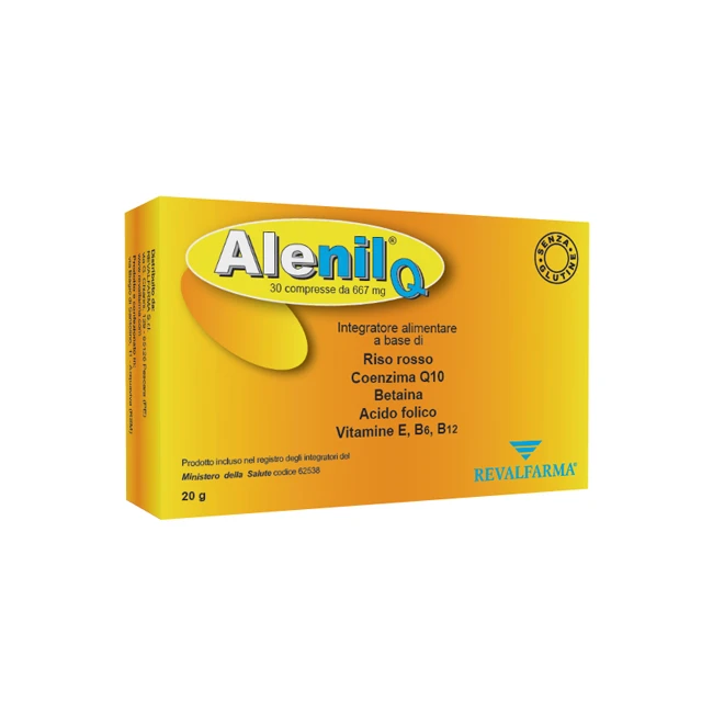 Gli integratori alimentari non vanno intesi come sostituti di una dieta variata, equilibrata e di uno stile di vita sano. Non superare la dose giornaliera raccomandata. Tenere fuori dalla portata dei bambini al di sotto dei tre anni di età. Non assumere in caso di allergia accertata o intolleranza verso uno o più componenti presenti nel prodotto. Il prodotto non deve essere consumato dalle donne in gravidanza o in allattamento, dai bambini di età inferiore a 18 anni e dagli adulti di età superiore a 70 anni. Il prodotto non deve essere consumato se si assumono medicinali per abbassare il colesterolo e se già si consumano altri prodotti contenenti riso rosso fermentato. Non assumere una quantità giornaliera di monacoline da riso rosso fermentato pari o superiore a 3 mg. La dose massima giornaliera di Alenil Q è pari ad una compressa, contenente 2,8 mg di monacoline. Consultare un medico sul consumo di questo prodotto se si manifestano problemi di salute.