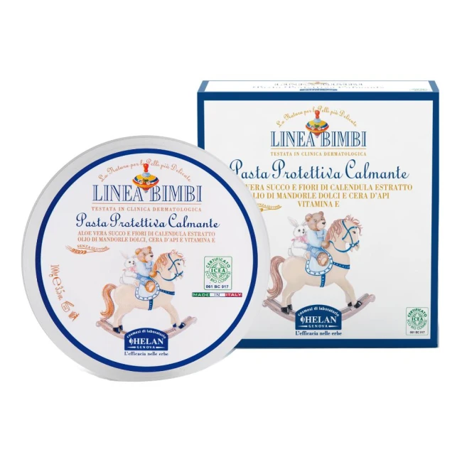 Pasta protettiva arricchita dall'olio di Mandorle dolci e cera d'Api, emollienti e lubrificanti, dall'attività rigenerante delle Vitamine C ed E, dall'Aloe vera succo ed estratto di fiori di Calendula, lenitivi e calmanti.
