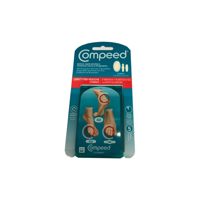 Confezione da 5 cerotti: 2 medi, 2 piccoli ed 1 per le dita dei piedi.