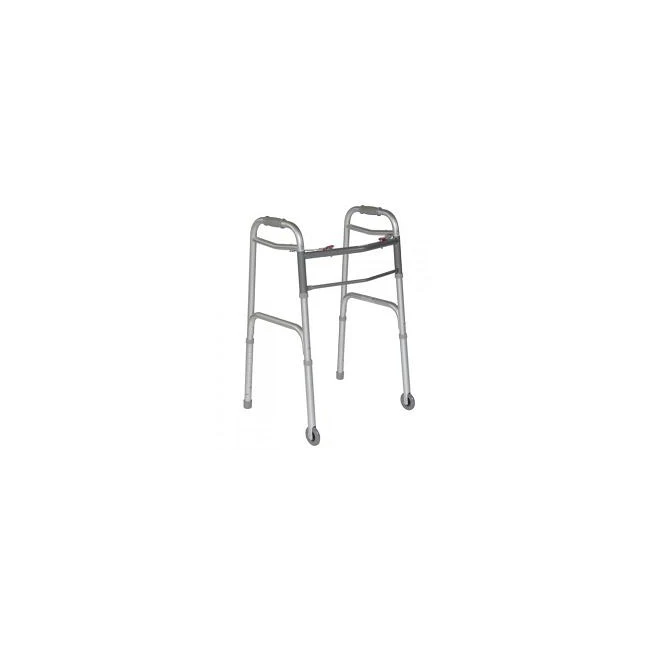 Deambulatore con ruote fisse e puntali con manopole imbottite, struttura in lega leggera. Fiancate ad avanzamento alternato per una maggiore stabilità e libertà di movimento.Base regolabile in altezza, tappi antiscivolo in gomma e pulsante a scatto, che facilita l’apertura e la chiusura del deambulatore.