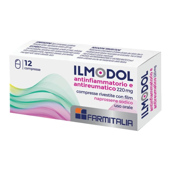 AvvertenzeNei bambini di età compresa tra 12 e 15 anni può essere usato solo dopo avere consultato il medico. L’uso di ILMODOL ANTINFIAMMATORIO E ANTIREUMATICO deve essere evitato in concomitanza di FANS, inclusi gli inibitori selettivi della COX-2. Gli effetti indesiderati possono essere minimizzati con l'uso della più bassa dose efficace per la più breve durata possibile di trattamento che occorre per controllare i sintomi (vedere paragrafo 4.2 e i paragrafi sottostanti sui rischi gastrointestinali e cardiovascolari). Gli analgesici, antipiretici, antinfiammatori non steroidei possono causare reazioni di ipersensibilità, potenzialmente gravi, comprese quelle di tipo anafilattico, anche in soggetti non precedentemente esposti a questo tipo di farmaci. Il rischio di reazioni di ipersensibilità dopo assunzione di naproxene è maggiore nei soggetti che abbiano presentato tali reazioni dopo l’uso di altri analgesici, antipiretici, antinfiammatori non steroidei (vedere controindicazioni). Il naproxene sodico non deve essere usato contemporaneamente ad altro farmaco a base di naproxene in quanto entrambi circolano nel sangue in forma ionizzata, come anione naproxenato. L’attività antipiretica e antinfiammatoria del naproxene può ridurre la febbre e l’infiammazione riducendo quindi l’utilità diagnostica di questi sintomi. Broncospasmo può insorgere in pazienti con asma bronchiale o malattie allergiche o che ne abbiano sofferto. Effetti gastrointestinali Sono stati riportati episodi di sanguinamento gastrointestinale in pazienti in trattamento con naproxene; pertanto, in pazienti con pregressa patologia gastrointestinale, naproxene deve essere somministrato sotto stretto controllo medico. Nel corso di terapia con antinfiammatori è possibile l’insorgere di gravi effetti collaterali a livello gastro-intestinale come emorragia e perforazione; il rischio di tale evenienza sembra incrementare linearmente con la durata del trattamento ed è probabilmente associato all’uso delle dosi più elevate di questi farmaci. Emorragia gastrointestinale, ulcerazione e perforazione: durante il trattamento con tutti i FANS, in qualsiasi momento, con o senza sintomi di preavviso o precedente storia di gravi eventi gastrointestinali, sono state riportate emorragia gastrointestinale, ulcerazione e perforazione, che possono essere fatali. Anziani:I pazienti anziani hanno un aumento della frequenza di reazioni avverse ai FANS, specialmente emorragie e perforazioni gastrointestinali, che possono essere fatali (vedere paragrafo 4.2). Negli anziani e in pazienti con storia di ulcera, soprattutto se complicata da emorragia o perforazione (vedere paragrafo 4.3), il rischio di emorragia gastrointestinale, ulcerazione o perforazione è più alto con dosi aumentate di FANS. Questi pazienti devono iniziare il trattamento con la più bassa dose disponibile. L’uso concomitante di agenti protettori (misoprostolo o inibitori della pompa protonica) deve essere considerato per questi pazienti e anche per pazienti che assumono basse dosi di aspirina o altri farmaci che possono aumentare il rischio di eventi gastrointestinali (vedere sotto e paragrafo 4.5). Pazienti con storia di tossicità gastrointestinale, in particolare anziani, devono riferire qualsiasi sintomo gastrointestinale inusuale (soprattutto emorragia gastrointestinale) in particolare nelle fasi iniziali del trattamento. Cautela deve essere prestata ai pazienti che assumono farmaci concomitanti che potrebbero aumentare il rischio di ulcerazione o emorragia, come corticosteroidi orali, anticoagulanti come warfarin, inibitori selettivi del reuptake della serotonina o agenti antiaggreganti come l’aspirina (vedere paragrafo 4.5). Quando si verifica emorragia o ulcerazione gastrointestinale in pazienti che assumono ILMODOL ANTINFIAMMATORIO E ANTIREUMATICO il trattamento deve essere sospeso. I FANS devono essere somministrati con cautela nei pazienti con una storia di malattie gastrointestinali (colite ulcerosa, morbo di Crohn) poiché tali condizioni possano essere esacerbate (vedere paragrafo 4.8 Effetti indesiderati). Si consiglia cautela nei consumatori abituali di alte dosi di alcool, in quanto a rischio di sanguinamento gastrico. L'uso del prodotto deve essere evitato nei casi di dolore di origine gastrointestinale. Effetti cardiovascolari e cerebrovascolari Un adeguato monitoraggio ed opportune istruzioni sono necessarie nei pazienti con anamnesi positiva per ipertensione e/o insufficienza cardiaca congestizia da lieve a moderata poiché in associazione al trattamento con i FANS sono stati riscontrati ritenzione di liquidi ed edema. Studi clinici e dati epidemiologici suggeriscono che l’uso dei coxib e di alcuni FANS (specialmente ad alti dosaggi e per trattamenti di lunga durata) può essere associato ad un modesto aumento del rischio di eventi trombotici arteriosi (p. es. infarto del miocardio o ictus). Sebbene alcuni dati suggeriscono che l’uso di naprossene (1000 mg/die) può essere associato a un più basso rischio, alcuni rischi non possono essere esclusi. Non ci sono dati sufficienti relativamente agli effetti della bassa dose di naprossene (600 mg/die) per arrivare a precise conclusioni su possibili rischi trombotici. I pazienti con ipertensione non controllata, insufficienza cardiaca congestizia, cardiopatia ischemica accertata, malattia arteriosa periferica e/o malattia cerebrovascolare devono essere trattati con naprossene soltanto dopo attenta valutazione. Analoghe considerazioni devono essere effettuate prima di iniziare un trattamento di lunga durata in pazienti con fattori di rischio per eventi cardiovascolari (p. es. ipertensione, iperlipidemia, diabete mellito, fumo). Il naproxene diminuisce l’aggregazione piastrinica e prolunga il tempo di sanguinamento. Tale effetto deve essere tenuto in considerazione quando vengono determinati i tempi di sanguinamento. Pazienti che soffrono di disordini della coagulazione o che sono