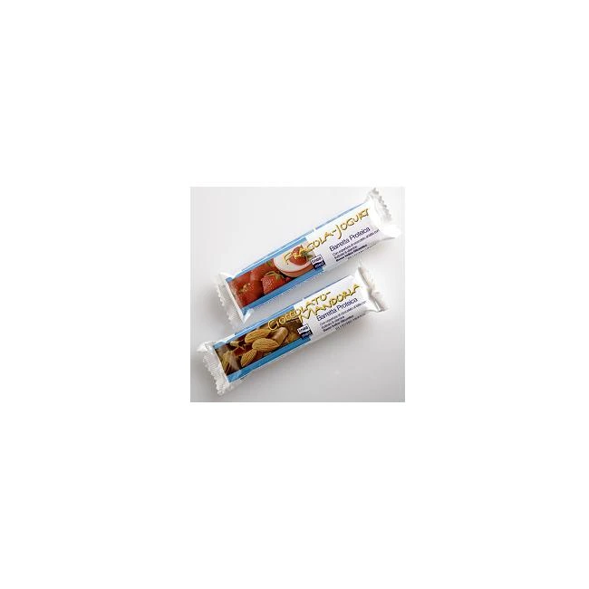 Barretta proteica con marzapane e copertura di cioccolato al latte arricchita con vitamine.