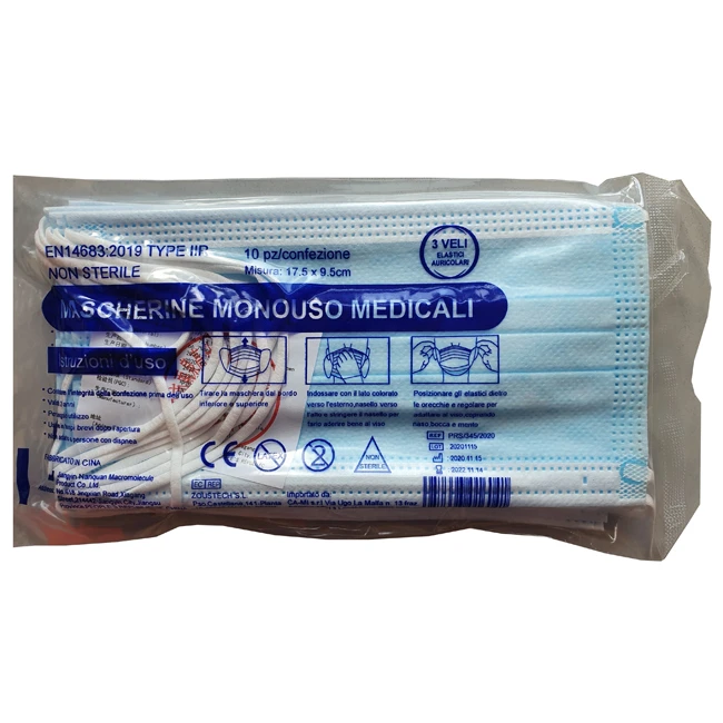 Mascherine monouso medicali adatte per il personale medico clinico da indossare durante l'operazione invasiva, coprendo la bocca, naso e mascella dell'utente, fornendo una barriera fisica per impedire il passaggio diretto di agenti patogeni, microrganismi, fluidi corporei, particelle, ecc...