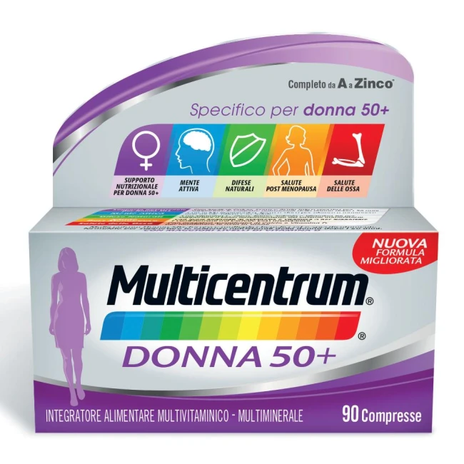 Integratore alimentare multivitaminico-multiminerale completo, formulato per soddisfare i fabbisogni nutrizionali delle donne dopo i 50 anni.