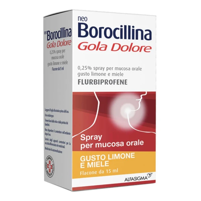 AvvertenzeAlle dosi consigliate, nell’usare il medicinale nelle sue diverse forme farmaceutiche, l’eventuale deglutizione non comporta, di per sé, alcun danno per il paziente, in quanto tali dosi sono ampiamente inferiori a quelle comunemente utilizzate nei trattamenti con il flurbiprofene per via sistemica. In pazienti con insufficienza renale, cardiaca o epatica il medicinale NEO BOROCILLINA GOLA DOLORE deve essere utilizzato con cautela. È consigliato non associare il medicinale con i FANS. L’uso, specie se prolungato, del prodotto può dare origine a fenomeni di sensibilizzazione o di irritazione locale; in tali casi occorre interrompere il trattamento e consultare il medico per istituire, se necessario, una terapia idonea. Non usare per trattamenti protratti. Dopo breve periodo di trattamento senza risultati apprezzabili consultare il medico. NEO BOROCILLINA GOLA DOLORE collutorio e NEO BOROCILLINA GOLA DOLORE spray per mucosa orale (tutte le presentazioni) contengono: - 960 mg di etanolo per 10 ml di collutorio. Può causare sensazione di bruciore sulla pelle danneggiata. - olio di ricino poliossidrato idrogenato che può causare reazioni sulla pelle localizzate. - paraidrossi benzoati che possono causare reazioni allergiche (anche ritardate). NEO BOROCILLINA GOLA DOLORE 0,25% spray per mucosa orale gusto arancia e miele e NEO BOROCILLINA GOLA DOLORE 0,25% spray per mucosa orale gusto limone e miele contengono anche il colorante giallo tramonto (E110), che può causare reazioni allergiche.NEO BOROCILLINA GOLA DOLORE 8,75 mg pastiglie (tutte le presentazioni) contiene isomalto: i pazienti affetti da rari problemi ereditari di intolleranza al fruttosio, non devono assumere questo medicinale.