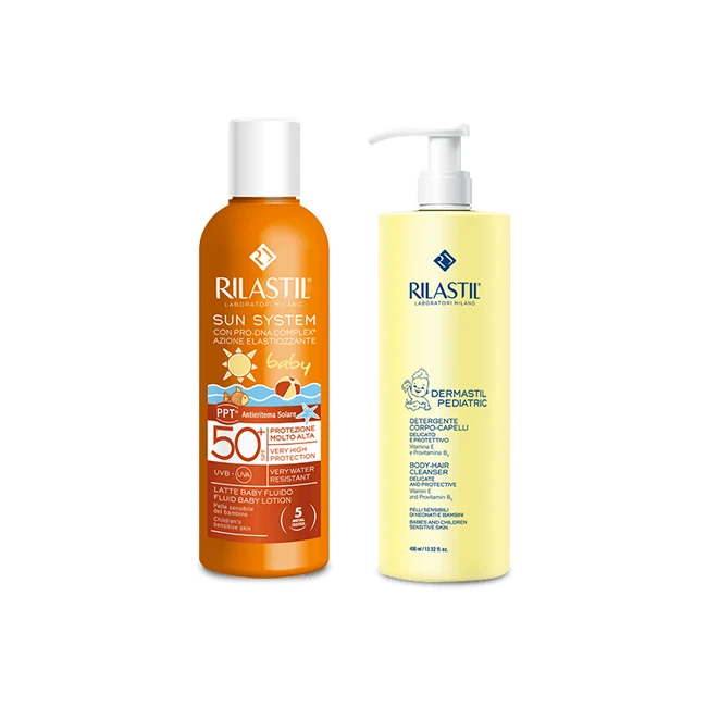 Prodotti Rilastil per la protezione solare e la detersione della pelle sensibile e delicata dei bambini.
