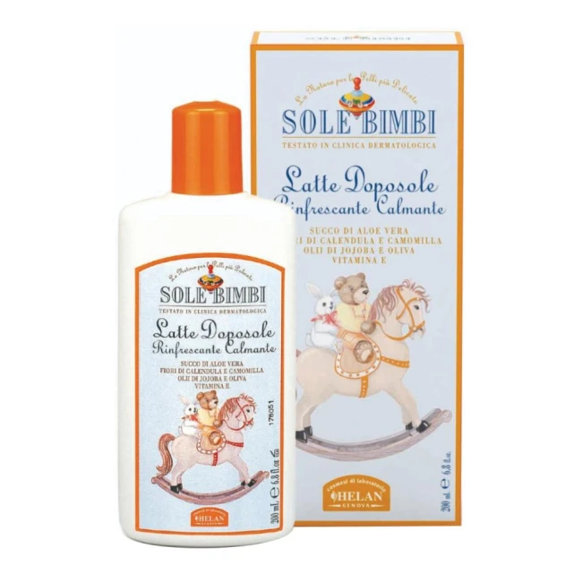 Morbido latte doposole che lascia sulla pelle dei bambini un senso di freschezza dopo l'esposizione al sole.