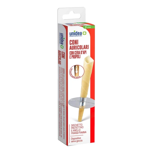 UNIDEA cono auricolare è perfezionato con tre dispositivi di protezione, che permettono l'utilizzo in tutta tranquillità. L'anello frangifiamma garantisce lo spegnimento autonomo della fiamma alla giusta altezza del cono; il dischetto protettivo protegge il capo e l'orecchio durante tutto il trattamento e il dispositivo ferma-goccia impedisce la caduta di qualsiasi eventuale residuo della combustione all'interno dell'orecchio.
