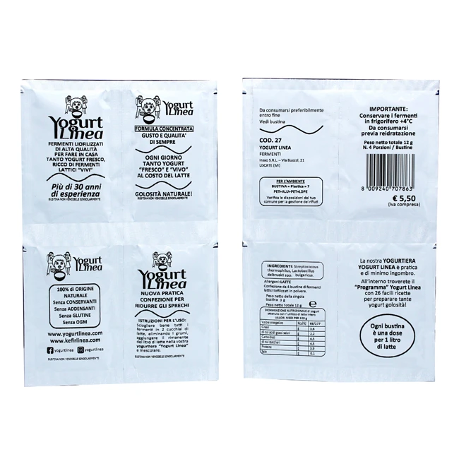 Fermenti liofilizzati per fare in casa tanto yogurt fresco, ricco di fermenti lattici” vivi”. Senza aggiunta di zuccheri, conservanti, addensanti, OGM.