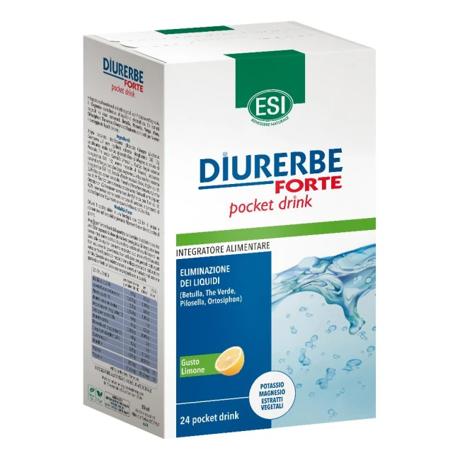 Diurerbe forte pocket drink contiene Potassio e Magnesio. Il Magnesio contribuisce all'equilibrio elettrolitico. Gli estratti vegetali in esso contenuti sono utili per favorire l'eliminazione dei liquidi in eccesso.