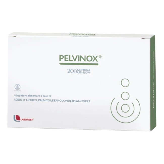 Integratore alimentare a base di acido alfa-lipoico, palmitoiletanolamide (PEA) e mirra, utile nei casi in cui sia richiesta una supplementazione di queste sostanze. L'esclusiva tecnica di produzione della compressa di Pelvinox garantisce il rilascio controllato nel tempo dell'acido alfa-lipoico.