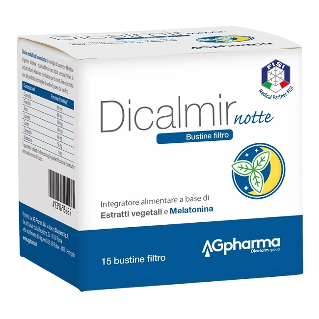 Integratore alimentare a base di Estratti vegetali utili per le funzioni digestive e melatonina. La melatonina contribuisce alla riduzione del tempo richiesto per prendere sonno e ad alleviare gli effetti del fuso orario. L'effetto benefico si ottiene assumendo 1 mg di melatonina poco prima di coricarsi (pari a 1 bustina di Dicalmir Notte). Per gli effetti sul fuso orario si consiglia di bere la tisana il primo giorno di viaggio e per alcuni giorni dopo l'arrivo a destinazione.