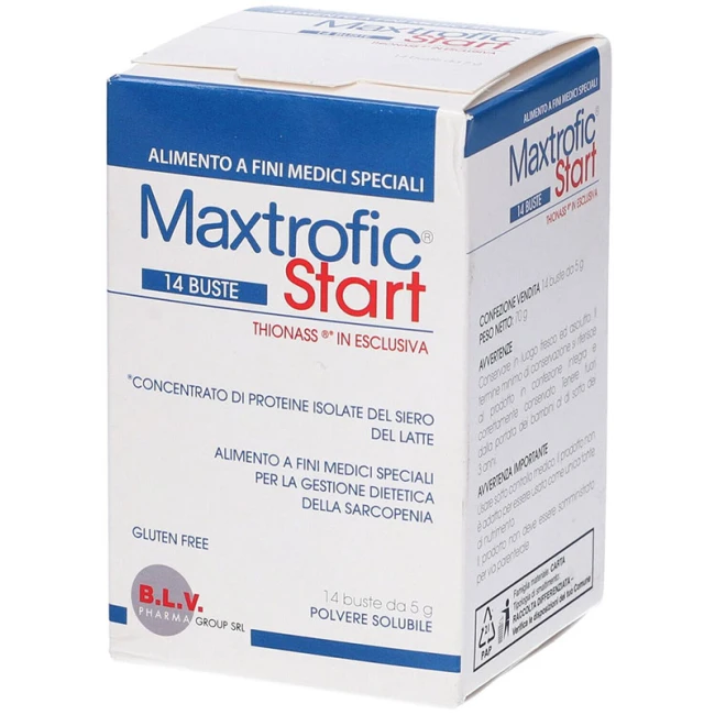 Si consiglia l'assunzione di 1 o 2 buste al giorno. Mettere 1 o 2 buste di Maxtrofic® Start solubile in un bicchiere. Aggiungere da 150 a 200 ml di acqua o qualsiasi altra bevanda (latte, te) purché fredda o, comunque, a temperatura ambiente. Mescolare brevemente (senza usare il frullatore) e bere immediatamente. In considerazione della sua solubilità, è consentita lo somministrazione di 1-2 busle di Maxtrofic® Start da diluire in 500 - 1000 ml di acqua, in base al calcolato fabbisogno idrico e proteico del paziente, altraverso sonda nasogastrica e/o PEG, secondo il giudizio del medico. Osmolarità: tra 3,2 mOsm/I c 7,0 mOsm/.