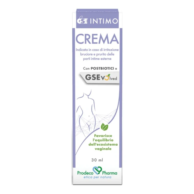 GSE Intimo Crema è un prodotto formulato con estratti vegetali e sostanze di origine naturale specificatamente scelti per dare sollievo in caso di irritazione, bruciore, arrossamento, secchezza e prurito delle parti intime esterne. Il gel di Aloe, l’olio di Oliva e gli estratti di Piantaggine e Calendula hanno un’azione emolliente, lenitiva e riducono la sensazione di prurito; gli estratti di Ippocastano e Amamelide, dall’azione astringente, contribuiscono a ridurre l’edema e il rossore. L’Estratto di semi di Pompelmo potenziato dal processo di iperfermentazione (GSEvolved) svolge un’azione antiossidante. I Fitosteroli vegetali, particolarmente indicati in caso di pelle secca e irritata, ristabiliscono l’equilibrio del microbiota. La formula è arricchita dalla presenza di postbiotici da Bifidobatteri e Lattobacilli che contribuiscono al bilanciamento della flora batterica e al mantenimento della barriera cutanea. La presenza di Acido lattico favorisce il fisiologico equilibrio dell’ecosistema vaginale.