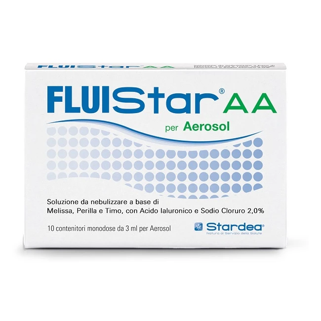 Dispositivo medico ad uso inalatorio costituito da una soluzione ipertonica a base di estratti secchi vegetali di Melissa officinalis, Perilla frutescens e Timo serpillo in combinazione con acido ialuronico. Fluistar AA è indicato per contrastare la sintomatologia conseguente ad alterazioni del trofismo dell'epitelio respiratorio quali tosse, rinorrea, dolore tipico delle sindromi influenzali, ma anche legata ad allergeni esterni. Alla base di queste condizioni vi è una riduzione della normale idratazione muscolare e una conseguente riduzione della clearance mucocillare. Questo provoca un ciclo vizioso che può sfociare in ostruzione delle vie aeree e suscettibilità ad infezioni virali e batteriche. Pertanto la nebulizzazione di sostanze idratanti come l'acido ialuronico, è il corretto approccio terapeutico, che ripristina il livello di idratazione, donando sollievo alla mucosa irritata. Contribuisce all'idratazione anche la giusta ipertonia della soluzione, ciò permette la fluidificazione e rimozione del muco. Gli estratti vegetali selezionati svolgono un'azione antiossidante e lenitiva contribuendo al ripristino dell'equilibrio fisiologico delle mucose respiratorie. La nebulizzazione di Fluistar AA è ottimale, anche per la pulizia della cavità nasale e delle altre vie respiratorie. Fluistar AA è una soluzione sterile, senza conservanti e pronta all'uso.