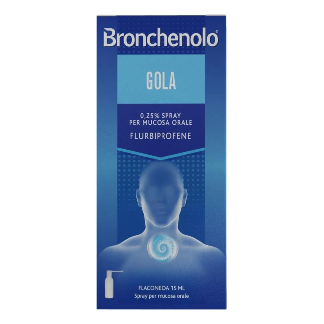 AvvertenzeAlle dosi consigliate, l’eventuale deglutizione di BRONCHENOLO GOLA 2,5 mg/ml Collutorio e BRONCHENOLO GOLA 2,5 mg/ml Spray per mucosa orale non comporta alcun danno per il paziente in quanto la dose di flurbiprofene è ampiamente inferiore a quella della posologia singola del medicinale per via sistemica. La somministrazione di flurbiprofene non è raccomandata nelle madri che allattano (vedere paragrafo 4.6). L’uso di BRONCHENOLO GOLA 2,5 mg/ml Collutorio e BRONCHENOLO GOLA 2,5 mg/ml Spray per mucosa orale, specie se prolungato, può dare origine a fenomeni di sensibilizzazione o di irritazione locale; in tali casi occorre interrompere il trattamento e consultare il medico per istituire, se necessario, una terapia idonea. Non usare per trattamenti prolungati oltre 7 giorni. Se non si notano risultati apprezzabili dopo 3 giorni di trattamento, la causa potrebbe essere una condizione patologica differente. Si consiglia in questi casi di consultare il medico. Anziani: i pazienti anziani hanno una aumentata frequenza di reazioni avverse ai FANS, specialmente emorragia gastrointestinale e perforazione, che possono essere fatali. Patologie respiratorie Sono stati riportati casi di broncospasmo con flurbiprofene in pazienti con anamnesi di asma bronchiale o allergie. Flurbiprofene deve essere usato con cautela in questi pazienti. Altri FANS È consigliabile non associare il medicinale con altri FANS (vedere paragrafo 4.5). Lupus eritematoso sistemico (LES) e malattia mista del tessuto connettivo I pazienti con Lupus eritematoso sistemico e malattia mista del tessuto connettivo possono presentare un aumentato rischio di meningite asettica (vedere paragrafo 4.8), tuttavia questo effetto non si osserva solitamente con prodotti destinati ad un uso limitato e di breve durata come flurbiprofene. Compromissione cardiaca, epatica e renale Il medicinale deve essere utilizzato con cautela in pazienti con insufficienza cardiaca, renale o epatica. È stato riportato che i FANS possono causare varie forme di nefrotossicità, incluse nefrite interstiziale, sindrome nefrosica e insufficienza renale. La somministrazione di un FANS può causare una riduzione dose-dipendente della formazione di prostaglandine e far precipitare l’insufficienza renale. I pazienti che presentano il rischio più elevato di sviluppare questa reazione sono quelli con compromissione della funzionalità renale, compromissione cardiaca, disfunzione epatica, quelli in terapia con diuretici e gli anziani; comunque, questo effetto non si osserva solitamente con prodotti destinati ad un uso limitato e di breve durata come flurbiprofene. Effetti cardiovascolari e cerebrovascolari Prima di iniziare il trattamento nei pazienti con anamnesi positiva per ipertensione e/o insufficienza cardiaca è richiesta cautela (discutere con il proprio medico o farmacista), poiché in associazione al trattamento con FANS sono stati riscontrati ritenzione di liquidi, ipertensione ed edema. Studi clinici e dati epidemiologici suggeriscono che l’uso di alcuni FANS specialmente ad alti dosaggi e per trattamenti di lunga durata, può essere associato ad un modesto aumento del rischio di eventi trombotici arteriosi come ad esempio infarto del miocardio o ictus. Non ci sono dati sufficienti per escludere un rischio simile per flurbiprofene. I pazienti con ipertensione non controllata, insufficienza cardiaca congestizia, cardiopatia ischemica accertata, malattia arteriosa periferica e/o malattia cerebrovascolare devono essere trattati con flurbiprofene soltanto dopo attenta valutazione. Analoghe considerazioni devono essere effettuate prima di iniziare un trattamento di lunga durata in pazienti con fattori di rischio per malattia cardiovascolare (p.es. ipertensione, iperlipidemia, diabete mellito, fumo). Effetti sul sistema nervoso centrale Cefalea indotta da analgesici. In caso di utilizzo prolungato o sregolato di analgesici si può manifestare cefalea, che non deve essere trattata aumentando la dose del medicinale. Effetti Gastrointestinali Flurbiprofene deve essere somministrato con cautela a pazienti con anamnesi di ulcera peptica e altre malattie gastrointestinali poiché tali condizioni possono essere riacutizzate. Il rischio di emorragia gastrointestinale, ulcera o perforazione è più alto all’aumentare del dosaggio di flurbiprofene in pazienti con una storia di ulcera, in particolare se complicata da emorragia e perforazione e negli anziani. Questi pazienti devono iniziare il trattamento con la più bassa dose disponibile. Emorragia gastrointestinale, ulcera o perforazione sono stati riportati con tutti i FANS in qualsiasi momento del trattamento. Queste reazioni avverse possono essere fatali e possono verificarsi con o senza sintomi di preavviso oppure in caso di precedente storia di gravi reazioni gastrointestinali. Pazienti con anamnesi di malattie gastrointestinali, soprattutto se anziani, devono riportare qualsiasi sintomo insolito di tipo addominale (specialmente emorragia gastrointestinale) nelle fasi iniziali di trattamento. Gli effetti indesiderati possono essere minimizzati con l’uso della più bassa dose efficace per la più breve durata possibile di trattamento che occorre per controllare i sintomi (vedere paragrafo 4.2). Deve essere raccomandata cautela in pazienti che ricevono medicinali concomitanti che possono incrementare il rischio di ulcerazione o sanguinamento, quali corticosteroidi orali, anticoagulanti come warfarin, inibitori selettivi del reuptake della serotonina o antiaggreganti piastrinici come acido acetilsalicilico (vedere paragrafo 4.5). Quando il sanguinamento o l’ulcerazione gastrointestinale si verifica in pazienti che stanno assumendo flurbiprofene, il trattamento deve essere interrotto. Effetti dermatologici L’uso del medicinale, specie se prolungato, può dare origine a fenomeni di sensibilizzazione o di irritazione locale. In tali casi occorre interrompere il trattamento e consultare un medico