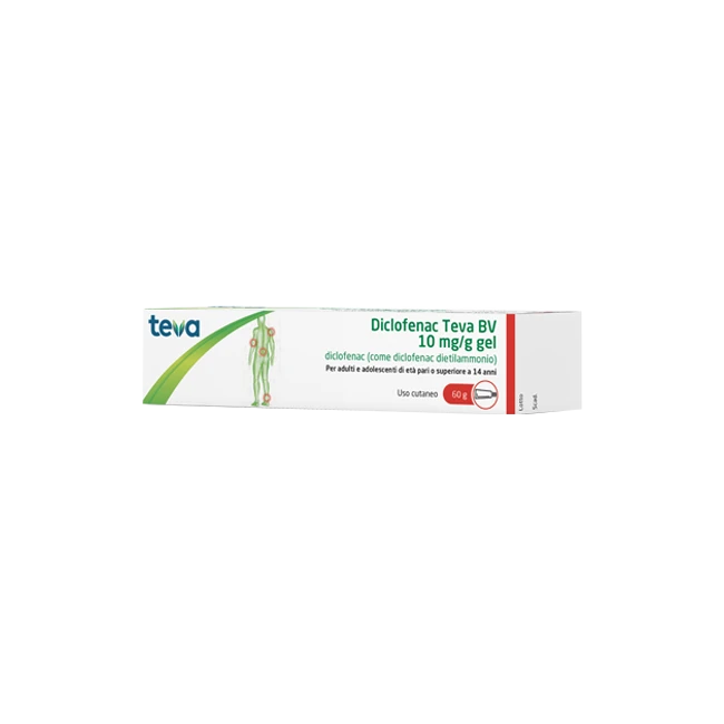PosologiaPosologia. Adulti e adolescenti di età pari o superiore a 14 anni: In base all’estensione della parte interessata da trattare, si applica 3-4 volte al giorno un quantitativo di dimensioni variabili tra una ciliegia e una noce, equivalente a 1-4 g di gel (11,6-46,4 mg di diclofenac dietilammonio corrispondenti a 10-40 mg di diclofenac sodico). Questa dose è sufficiente per trattare un’area di 400-800 cm². La dose massima giornaliera è di 16 g di gel, corrispondenti a 185,6 mg di diclofenac, sale di dietilammonio (corrispondenti a 160 mg di diclofenac sodico). La durata d’uso dipende dai sintomi e dalla malattia di base. Diclofenac Teva BV non può essere usato per più di una settimana senza consultare il medico. Se i sintomi peggiorano o non migliorano entro 3-5 giorni, occorre consultare il medico. Gruppi di pazienti speciali. Pazienti anziani: Non sono richiesti speciali adeguamenti della dose. A causa del potenziale profilo di effetti indesiderati, le persone anziane devono essere sottoposte ad un attento monitoraggio. Pazienti con compromissione della funzionalità renale: Non è necessaria alcuna riduzione della dose per i pazienti con compromissione della funzionalità renale. Pazienti con compromissione della funzionalità epatica: Non è richiesta alcuna riduzione della dose per i pazienti con compromissione della funzionalità epatica. Bambini e adolescenti (al di sotto dei 14 anni): Non sono disponibili dati sufficienti sull’efficacia e la sicurezza nei bambini e negli adolescenti al di sotto dei 14 anni (vedere paragrafo 4.3). Modo di somministrazione: Per uso cutaneo. Si applica un sottile strato di gel sulle parti del corpo interessate e si friziona delicatamente per farlo penetrare nella pelle. Le mani devono essere lavate a meno che non siano la zona da trattare. Prima di applicare un bendaggio (vedere paragrafo 4.4), occorre lasciar asciugare il gel sulla pelle per qualche minuto.